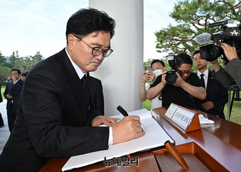 우원식 국회의장이 28일 오전 서울 동작구 국립서울현충원에서 참배를 마치고 방명록을 작성하고 있다