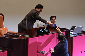 주호영 국민의힘 의원이 27일 오후 국회에서 열린 본회의에서 부의장으로 선출된 뒤 우원식 국회의장과 인사를 하고 있다.