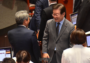이재명 더불어민주당 전 대표가 27일 오후 서울 여의도 국회에서 열린 본회의에서 국회부의장 선거 투표를 마치고 동료 의원들과 인사를 나누고 있다.