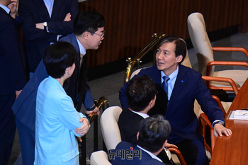 조국 조국혁신당 대표와 박찬대 더불어민주당 원내대표가 27일 오후 국회에서 열린 본회의에서 대화를 나누고 있다.