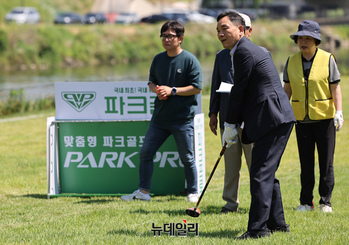 [포토] 강남탄천 파크골프장 준공, 시타하는 조성명 강남구청장