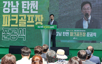 이진찬 성남시 부시장이 26일 오전 서울 강남구 세곡동 탄천파크골프장에서 열린 준공식에서 인사말을 하고 있다. 이날 준공한 강남탄천 파크골프장은 규모 2만4,552㎡의 27홀로 현재 서울에 있는 파크골프장 11곳 가운데 가장 크다.A, B, C 3개 코스 각