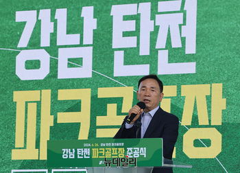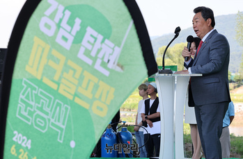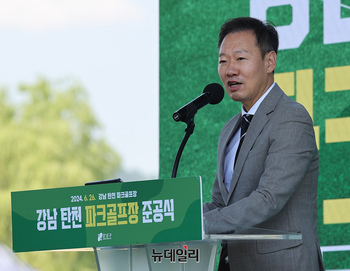 조성명 강남구청장이 26일 오전 서울 강남구 세곡동 탄천파크골프장에서 열린 준공식에서 인사말을 하고 있다. 이날 준공한 강남탄천 파크골프장은 규모 2만4,552㎡의 27홀로 현재 서울에 있는 파크골프장 11곳 가운데 가장 크다.A, B, C 3개 코스 각 9개