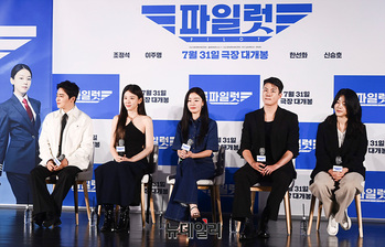 배우 조정석, 이주명, 한선화, 신승호, 김한결 감독이 26일 오전 서울 광진구 롯데시네마 건대입구점에서 열린 영화 '파일럿(감독 김한결)' 제작보고회에서 취재진의 질문에 답하고 있다.영화 '파일럿'은 스타 파일럿에서 하루아침에 실직자가 된 한정우(조정석 분)가 파격