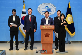 국민의힘 법제사법위원회 소속 위원들이 25일 오후 국회 소통관에서 민주당 '방송장악3법 강행처리 규탄 성명'을 발표하고 있다.