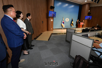 장동혁·배현진·고동진 국민의힘 의원이 24일 오후 국회 소통관에서 박정훈 의원의 최고위원 출마 기자회견을 지켜보고 있다.