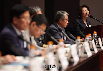 백선엽 장군의 장녀 백남희 재단 명예이사장이 24일 오후 서울 중구 한국프레스센터에서 '백선엽 장군의 전쟁철학과 한미동맹'을 주제로 열린 제1회 백선엽장군기념재단 국제학술회의에서 축사를 하고 있다. 이날 학술회의는 '6.25전쟁 중의 백선엽 장군과 미군' '백