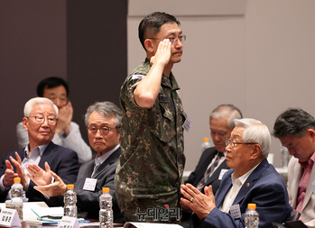 김홍준 육군본부 정책실장이 24일 오후 서울 중구 한국프레스센터에서 '백선엽 장군의 전쟁철학과 한미동맹'을 주제로 열린 제1회 백선엽장군기념재단 국제학술회의에 참석해 인사를 하고 있다. 이날 학술회의는 '6.25전쟁 중의 백선엽 장군과 미군' '백선엽 장군의
