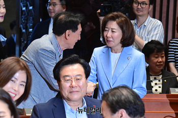 당 대표 출마 선언을 한 나경원 국민의힘 의원이 24일 오전 국회에서 열린 의원총회에서 동료 의원들과 인사를 하고 있다.