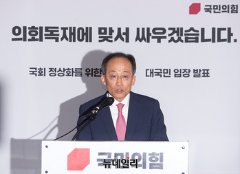 추경호 국민의힘 원내대표가 24일 오전 서울 여의도 국회 로텐더홀에서 '국회 정상화를 위한 대국민 입장 발표'를 하고 있다.