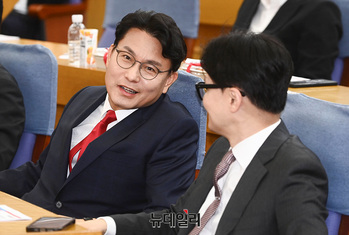 윤상현 국민의힘 의원과 한동훈 전 비상대책위원장이 24일 오전 서울 여의도 국회 의원회관에서 열린 '헌법 제84조 논쟁, 피고인이 대통령 되면 재판이 중단되는가?' 주제로 열린 초선의원 첫번째 공부모임에서 대화를 나누고 있다.