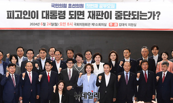 정점식 국민의힘 정책위의장(왼쪽부터), 추경호 원내대표, 윤상현 의원, 한동훈 전 비상대책위원장, 나경원 의원, 원희룡 전 국토부 장관, 황우여 비상대책위원장이 24일 오전 서울 여의도 국회 의원회관에서 열린 '헌법 제84조 논쟁, 피고인이 대통령 되면 재판이 중단되는