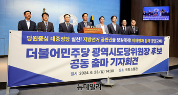 더불어민주당 광역시도당위원장 후보들이 23일 오후 국회 소통관에서 공동 출마 기자회견을 갖고 있다.