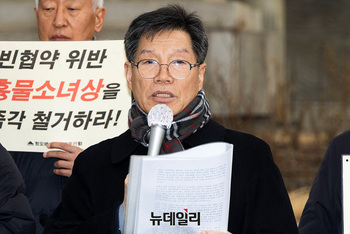 김병헌 위안부법폐지국민행동 대표가 4일 오후 서울 종로구 청와대 앞에서 열린 위안부법폐지운동본부 활동을 비판한 이재명 대통령에게 사과를 요구하는 기자회견에서 발언하고 있다.