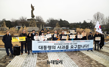 김병헌 위안부법폐지국민행동 대표와 류석춘 전 연세대학교 교수를 비롯한 참석자들이 4일 오후 서울 종로구 청와대 앞에서 열린 위안부법폐지운동본부 활동을 비판한 이재명 대통령에게 사과를 요구하는 기자회견을 하고 있다.