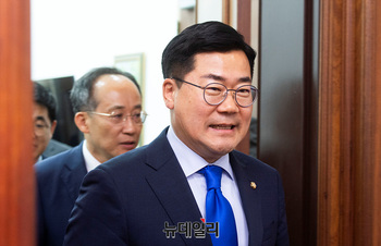 박찬대 더불어민주당 원내대표와 추경호 국민의힘 원내대표가 17일 오후 서울 여의도 국회의장실에서 '국회 원 구성' 관련 논의하기 위해 이동하고 있다.
