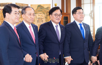 우원식 국회의장과 박찬대 더불어민주당 원내대표, 추경호 국민의힘 원내대표가 17일 오후 서울 여의도 국회의장실에서 '국회 원 구성' 관련 논의에 앞서 기념촬영을 하고 있다.