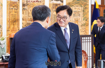 우원식 국회의장이 17일 오후 서울 여의도 국회의장실에서 박찬대 더불어민주당 원내대표, 추경호 국민의힘 원내대표와 인사를 나누고 있다.