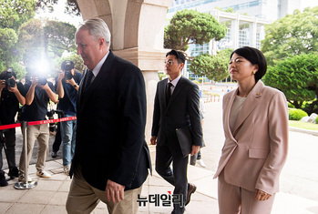 인요한 의료개혁특위원장과 한지아, 박준태 위원이 17일 오후 서울 종로구 서울대학교병원을 찾아 김영태 병원장과 면담을 위해 이동하고 있다.