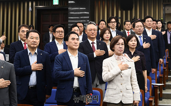 국민의힘 의원들이 17일 오전 서울 여의도 국회에서 열린 의원총회에서 국민의례를 하고 있다.