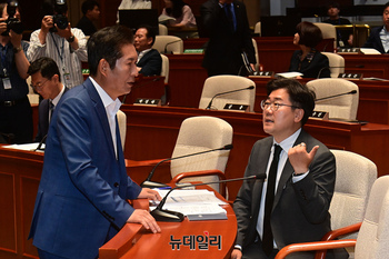 박찬대 더불어민주당 원내대표와 정청래 의원이 13일 오전 국회에서 열린 정책 의원총회에서 대화를 하고 있다.