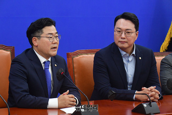 천하람 개혁신당 원내대표가 11일 오후 국회에서 박찬대 더불어민주당 원내대표를 예방해 환담을 나누고 있다.