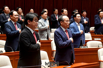[포토] 국민의례 하는 추경호 국민의힘 원내대표