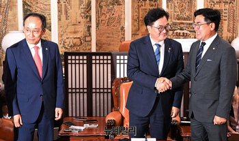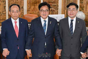 우원식 국회의장과 추경호 국민의힘 원내대표, 박찬대 더불어민주당 원내대표가 10일 국회의장실에서 원 구성 협상 관련 회동에 앞서 기념촬영을 하고 있다.