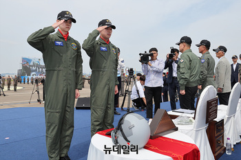 'F-4E 팬텀 퇴역식'이 7일 오전 경기 수원공군기지에서 열린 가운데 후배 조종사들이 헌정한 팬텀과 함께 임무를 수행하다가 불의의 사고로 순직한 조종사들을 기리기 위한 조종헬멧과 태극기가 놓여 있다. (사진=공동취재단)