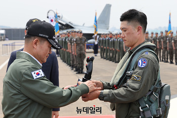 F-4E 팬텀 조종사가 7일 오전 경기 수원공군기지에서 열린 'F-4E 팬텀 퇴역식'에서 신원식 국방장관에게 임무종료보고를 하며 조종간을 반납하고 있다. (사진=공동취재단)