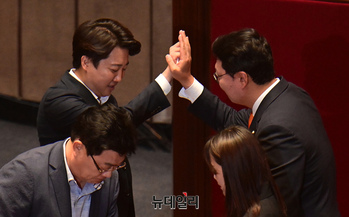 이준석 개혁신당 대표가 5일 오후 국회에서 열린 제22대 국회 첫 본회의에서 전반기 국회의장 투표를 하며 천하람 원내대표와 하이파이브를 하고 있다.