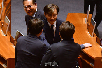 조국 조국혁신당 대표가 5일 오후 국회에서 열린 제22대 국회 첫 본회의에서 전반기 국회의장 투표를 마치고 의원들과 인사를 나누고 있다.