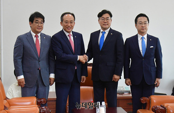 추경호 국민의힘 원내대표와 박찬대 더불어민주당 원내대표가 5일 오전 국회에서 제22대 국회 원 구성 협상을 위한 회동에서 악수를 나누고 있다.