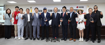 황우여 국민의힘 비상대책위원장이 4일 오전 서울 여의도 국민의힘 중앙당사에서 열린 '2024 총선 지원 연예인 자원봉사단 간담회'에서 가수 하동진 씨에게 감사패를 수여하고 있다.