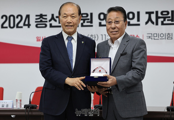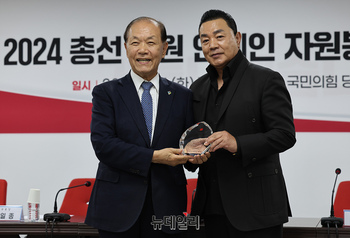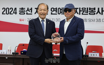 황우여 국민의힘 비상대책위원장이 4일 오전 서울 여의도 국민의힘 중앙당사에서 열린 '2024 총선 지원 연예인 자원봉사단 간담회'에서 가수 김흥국 씨에게 감사패를 수여하고 있다.