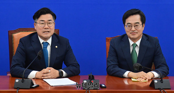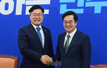 김동연 경기도지사가 3일 오전 국회에서 박찬대 더불어민주당 원내대표를 만나 환담을 나누고 있다.