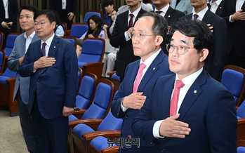추경호 국민의힘 원내대표 및 소속 의원들이 3일 국회에서 열린 의원총회에서 국민의례를 하고 있다.