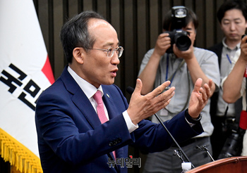 추경호 국민의힘 원내대표가 3일 국회에서 열린 의원총회에서 모두발언을 하고 있다. 이날 추 원내대표는 민주당을 향해 "법사위가 정 탐나시면 국회의장직을 달라. 그것이 순리"라고 발언 했다.