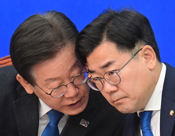 이재명 더불어민주당 대표가 29일 오전 국회에서 열린 최고위원회의에서 박찬대 원내대표와 대화를 나누고 있다.이날 이 대표는 북한의 도발에 대해 정부를 향해 "하루빨리 소통 채널을 복원해서 한반도 긴장을 완화해 나갈 것을 촉구한다"고 밝혔다.
