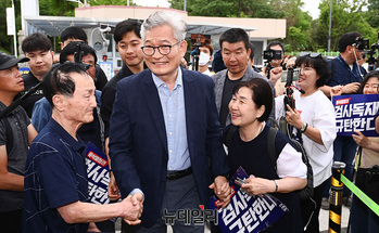 헌정 사상 최초로 옥중 창당한 송영길 소나무당 대표가 더불어민주당 전당대회 돈봉투 의혹으로 구속된지 163일만인 30일 오후 경기 의왕시 서울구치소에서 보석 출소하며 지지자들과 인사를 나누고 있다. (경기 의왕=서성진 기자)