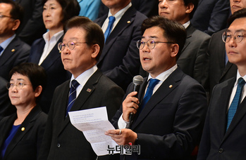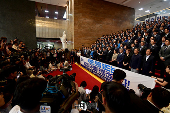 이재명 더불어민주당 대표와 박찬대 원내대표 및 22대 국회의원들이 30일 오후 국회 로텐더홀 앞 계단에서 열린 의원총회에서 '국민의 뜻을 받드는 국회를 만들겠다'구호를 외치고 있다.