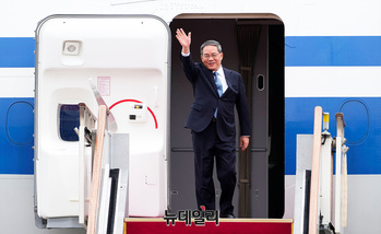 리창 중국 총리가 한중일 정상회의를 하루 앞둔 26일 오후 경기 성남시 서울공항에 도착해 손을 흔들고 있다. (경기 성남=서성진 기자)