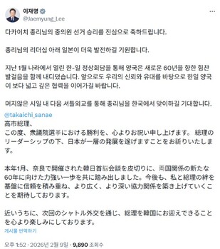 이재명 대통령은 일본 총선에서 집권 자민당의 압승을 이끈 다카이치 사나에 총리에게 9일 "중의원 선거 승리를 진심으로 축하드린다"고 했다.이 대통령은 이날 사회관계망서비스(SNS)인 엑스(X·옛 트위터)에 한국어와 일본어로 "총리님의 리더십 아래 일본이 더욱 발전하길