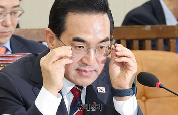 박홍근 기획예산처 장관 후보자가 23일 오전 국회 재정경제기획위원회에서 열린 인사청문회에서 안경을 고쳐쓰고 있다.