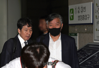 김홍희 전 해양경찰청장이 24일 오전 서울 서초구 중앙지법에서 열린 '서해 피격 사건' 공판에 출석하고 있다.