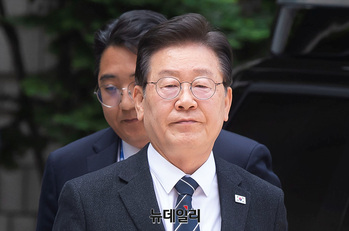 이재명 더불어민주당 대표가 24일 오전 서울 서초구 중앙지법에서 열린 '대장동 배임 및 성남FC 뇌물 혐의' 공판에 출석하고 있다. 이날 중앙지법에는 가수 김호중 영장실질심사를 앞두고 취재진들이 대거 몰렸다.