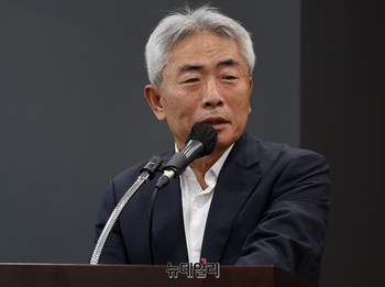 정규재 전 한국경제 주필이 22일 오후 서울 종로구 서울글로벌센터에서 포럼1948, 정규재TV 주최로 열린 춘계 공개포럼에서 인사말을 하고 있다. 이번 포럼은 '1950 한강 인도교 폭파의 재구성'을 주제로 송재윤 맥마스터대 교수가 미 종군기자 3인의 이야기로