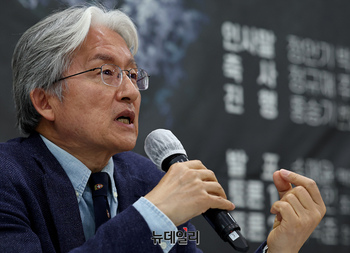 송재윤 캐나다 맥사스터대학 교수가 22일 오후 서울 종로구 서울글로벌센터에서 포럼1948, 정규재TV 주최로 열린 춘계 공개포럼에서 '1950 한강 인도교 폭파의 재구성'을 주제로 발표하고 있다. 이어진 토론에는 박종인 조선일보 기자, 류석춘 연세대 명예교수가 나섰다.