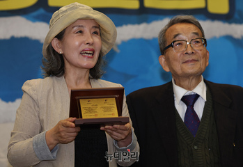 박선영 사단법인 물망초 이사장이 22일 오후 서울 중구 한국프레스센터에서 열린 '제3회 물망초인 시상식'에서 '오가와 하루히사( 小川晴久, 84세)' 도쿄대학 명예교수에게 시상하고 있다. 이번 시상식에서 수상한 '오가와 하루히사' 명예교수는 '북조선 강제 수용