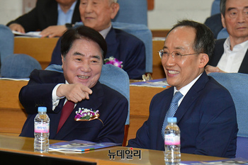 추경호 국민의힘 원내대표와 이석현 새로운미래 비상대책위원장이 22일 국회 의원회관에서 열린 민주화추진협의회 결성 40주년 기념식에서 대화를 하고 있다.